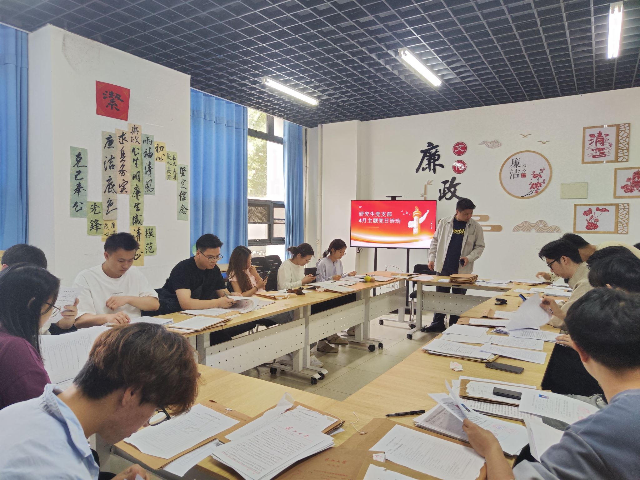 研究生党支部在22栋124会议室开展4月主题党日活动。活动由研究生辅导员盖东芳主持。